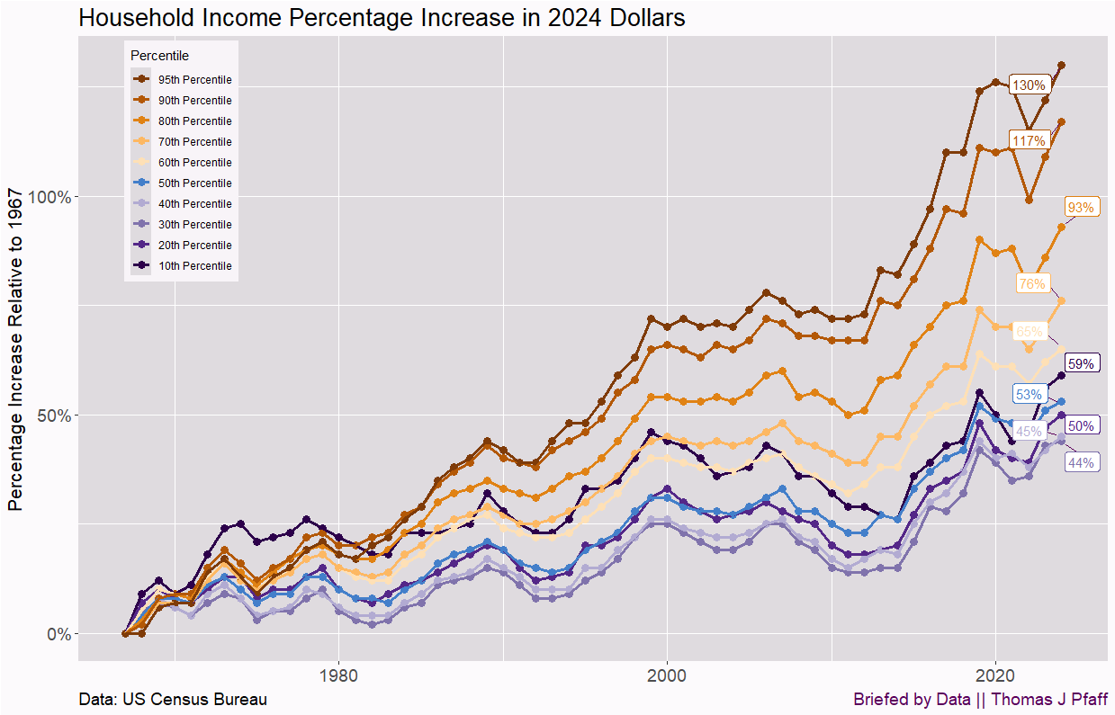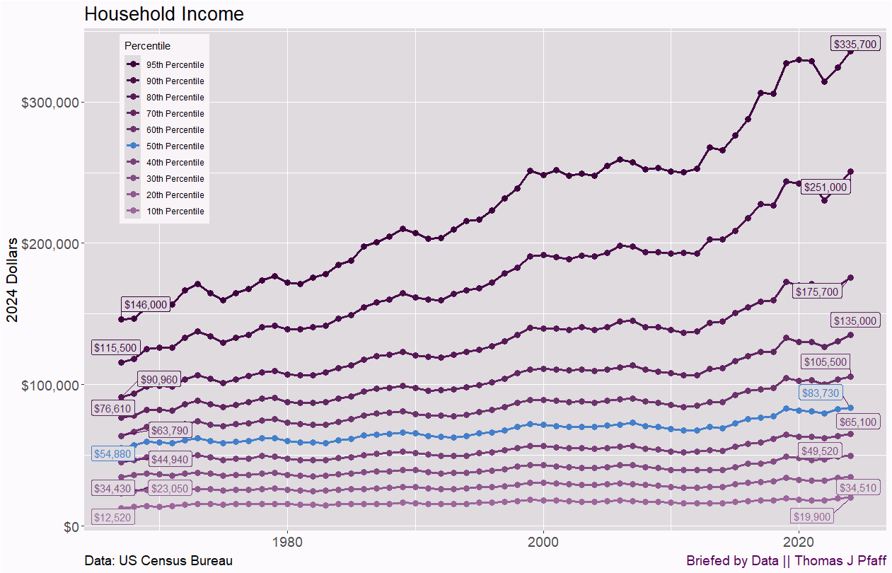 Figure 1 is household income in 2024 dollars from the Census Bureau (Table A-4a). The blue line is the median, and the median household income has increased from $54,880 in 1967 to $83,730 in 2024, relative to 2024 dollars. The striking feature of this graph is the significant disparity in changes in median income, with those in the 95th percentile experiencing an increase of more than $189,700 (over double), while those in the bottom 10% saw a 59% increase, amounting to only $7,380.