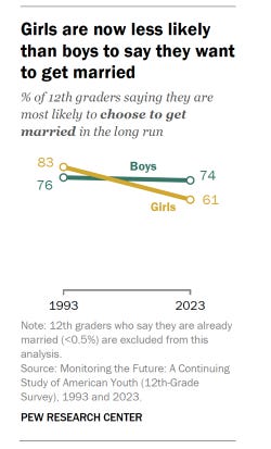 The chart from Pew’s 12th grade girls are less likely than boys to say they want to get married someday (11/14/2025) is fascinating. Over a 30-year period, that is a large decline in girls' views on marriage.
