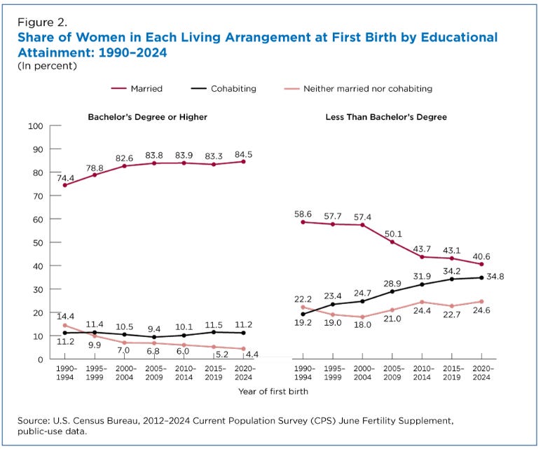 Now, left-leaning women are predominately college educated, making this graph from the Census Bureau fascinating. (12/16/2025) For women with a college degree that have kids, 85% are married. It appears there is a disconnect here. It would be nice if this graph was by liberal or conservative women, but it suggests that the attitude of college women that marriage is bad for them changes if they want kids, as they sure seem to prefer being married when having children.