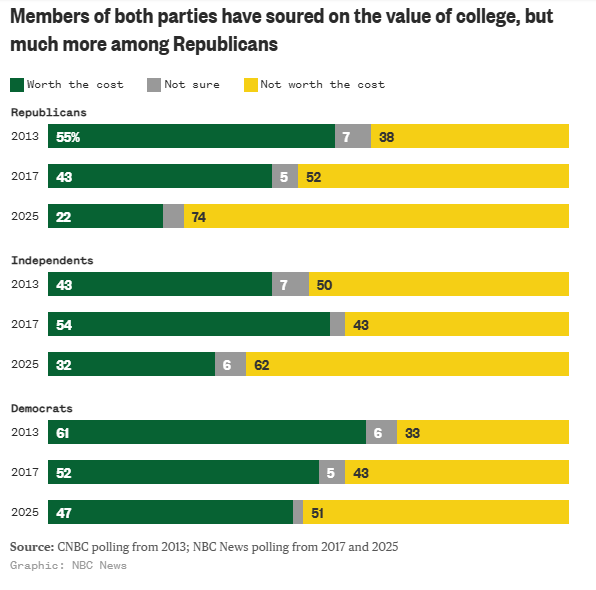 The first result is from an NBC News poll reported in Poll: In a dramatic shift, Americans no longer see four-year college degrees as worth the cost (11/28/2025)