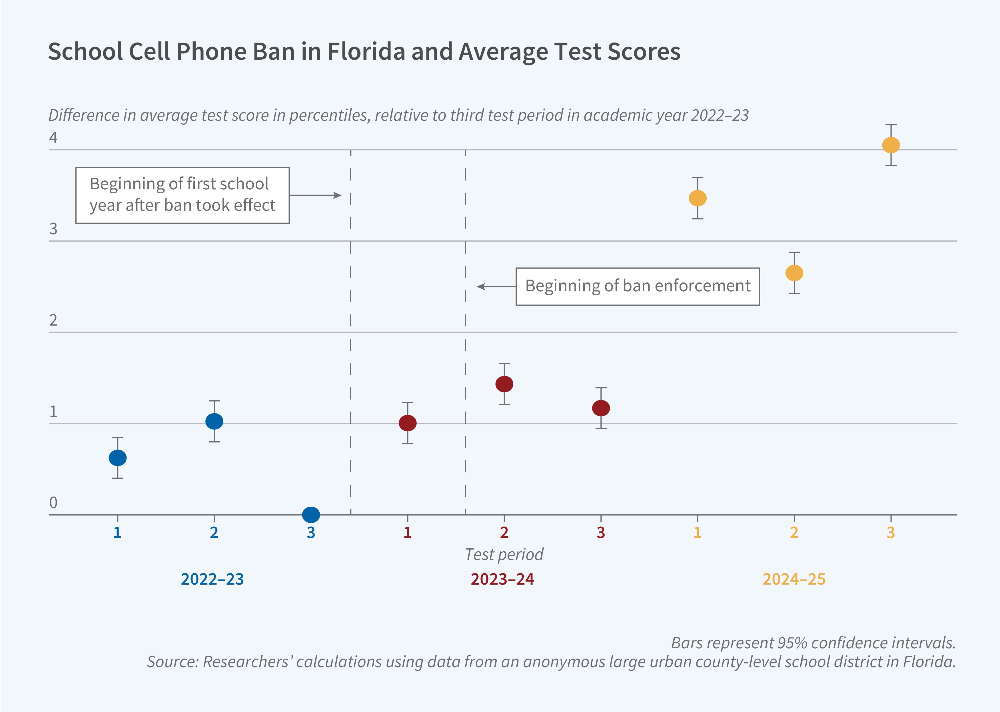 I keep saying that COVID isn’t the real issue with declines in test scores, and the NBER working paper The Impact of Cell Phone Bans in Schools on Student Outcomes: Evidence from Florida (12/1/2025) has some evidence.